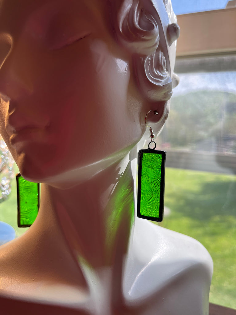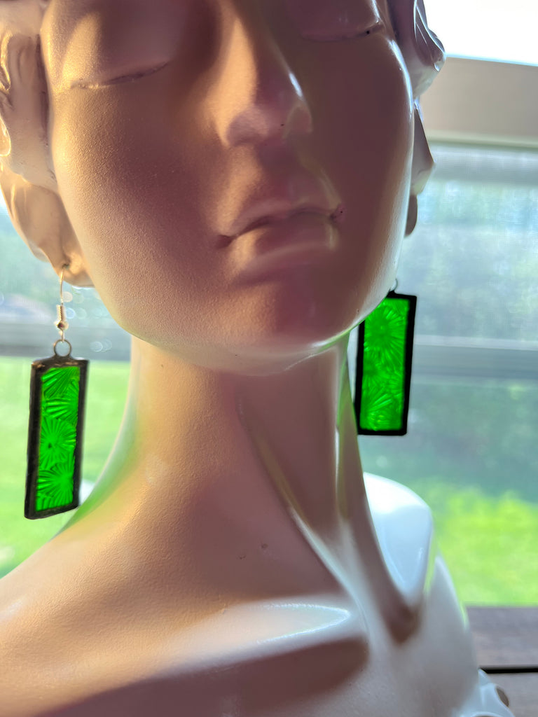 Hand cut green florentine glass earrings made in Tiffany style with copper foil and lead free solder, finished with black patina for an antique look. The earrings are lightweight, weighing in around 6 grams a piece, and have .925 silver hypoallergenic hooks.