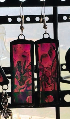 Hand cut stained glass earrings made in Tiffany style with copper foil and lead free solder. They weigh only 4 grams. For reference a US quarter weighs 6 grams. They have .925 silver hypoallergenic hooks.