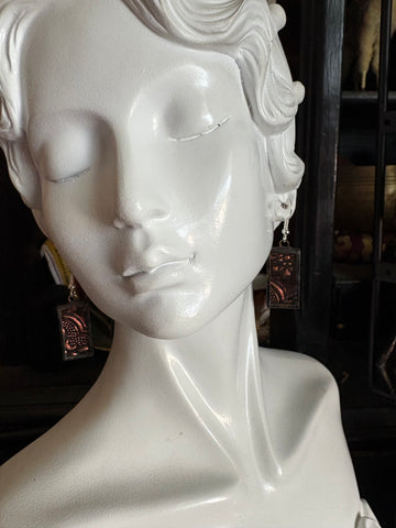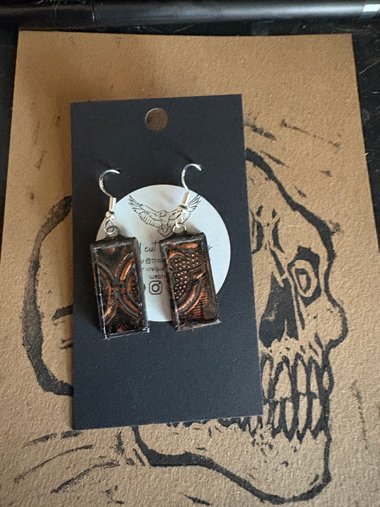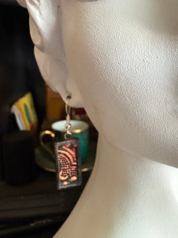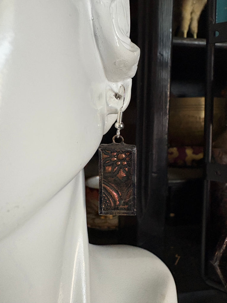 Van Gogh glass is a reflective glass, meaning they most beautiful when light hits them, but does not pass through them. They’re perfect for low light situations or when wearing your hair down. Each pair is a unique cut from a large patterned sheet of glass.
