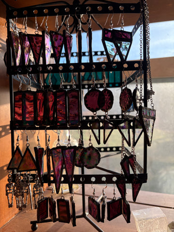Hand cut stained glass earrings made in Tiffany style with copper foil and lead free solder. They weigh 5 grams. For reference a US quarter weighs 6 grams. They have .925 silver hypoallergenic hooks.