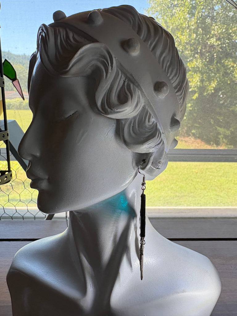 Hand cut stained glass pieces made in Tiffany style with copper foil and lead free solder. They weigh 5 grams. For reference a US quarter weighs 6 grams. They have .925 silver hypoallergenic hooks.