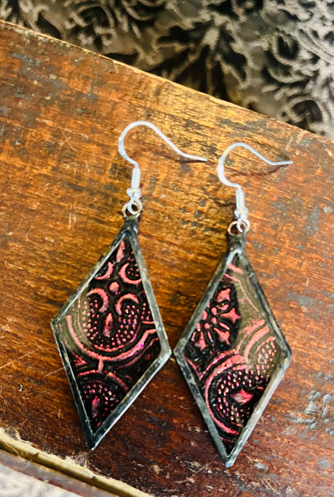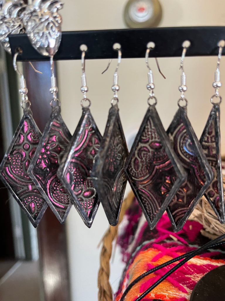 Hand cut 2” stained glass earrings made in Tiffany style with copper foil and lead free solder. They weigh 6 grams. For reference a US quarter weighs 6 grams. They have .925 silver hypoallergenic hooks.