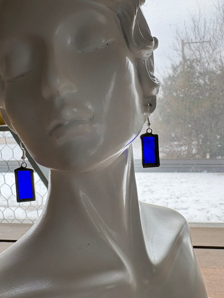 This gorgeous, glue chip cobalt stained glass is absolutely stunning in the light! They are hand cut stained glass and made in Tiffany style with copper foil and lead free solder, finished with black patina for an antique look. They weigh in at 4 grams a piece, and have .925 sterling hooks. For reference, a US quarter coin weighs 6 grams. My pieces are all hand cut glass, so there are slight irregularities that provide artistic uniqueness.