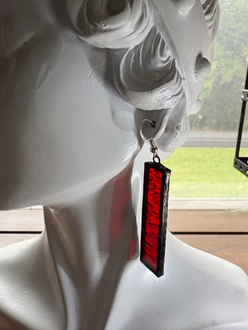 These earrings are hand cut stained glass made in Tiffany style with copper foil and lead free solder, finished with black patina for an antique look. The earrings weigh in at 6 grams a piece and are on .925 sterling silver hooks. My pieces are all hand cut glass, so there are slight irregularities that provide artistic uniqueness.