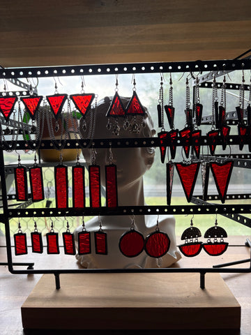 These earrings are hand cut stained glass made in Tiffany style with copper foil and lead free solder, finished with black patina for an antique look. The earrings weigh in at 3 grams a piece and are on .925 sterling silver hooks. My pieces are all hand cut glass, so there are slight irregularities that provide artistic uniqueness.