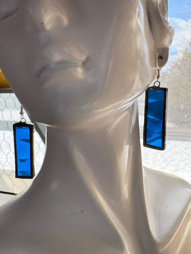 This gorgeous,deep blue Waterglass stained glass is absolutely stunning in the light! They are hand cut stained glass and made in Tiffany style with copper foil and lead free solder, finished with black patina for an antique look. They weigh in at 5 grams a piece, and have .925 sterling hooks. For reference, a US quarter coin weighs 6 grams. My pieces are all hand cut glass, so there are slight irregularities that provide artistic uniqueness.