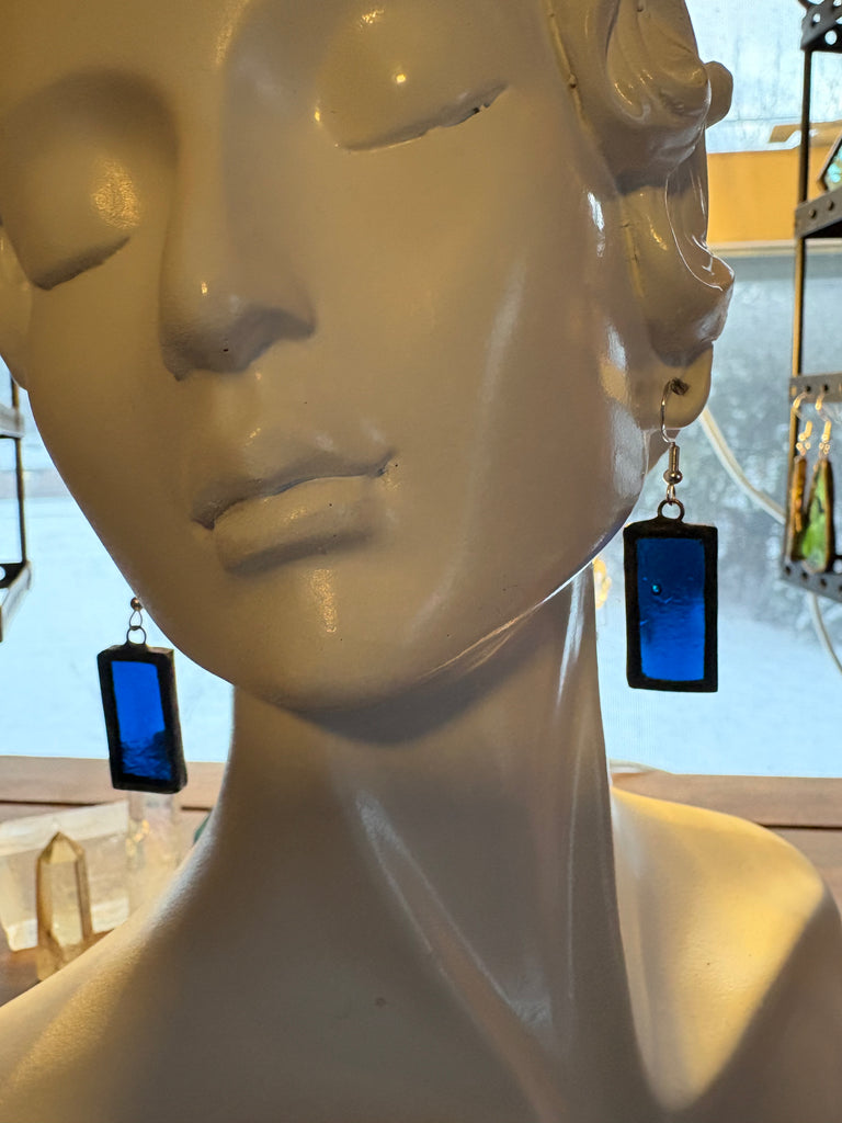 This gorgeous,deep blue Waterglass stained glass is absolutely stunning in the light! They are hand cut stained glass and made in Tiffany style with copper foil and lead free solder, finished with black patina for an antique look. They weigh in at 3 grams a piece, and have .925 sterling hooks. For reference, a US quarter coin weighs 6 grams. My pieces are all hand cut glass, so there are slight irregularities that provide artistic uniqueness.