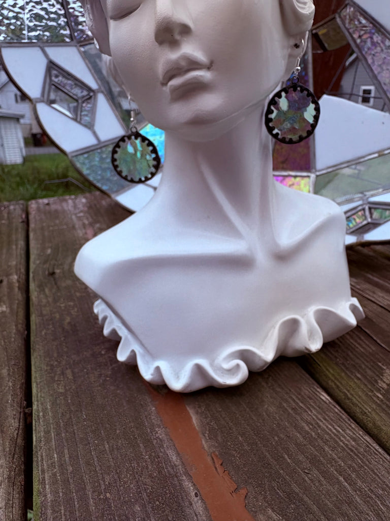 Hand cut 1.25” iridescent clear stained glass earrings made in Tiffany style with copper foil and lead free solder. These earrings weigh in at 7 grams a piece. For reference a US quarter weighs 6 grams. They have .925 silver hypoallergenic hooks. They are made from upcycled vintage stained glass lights.