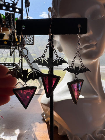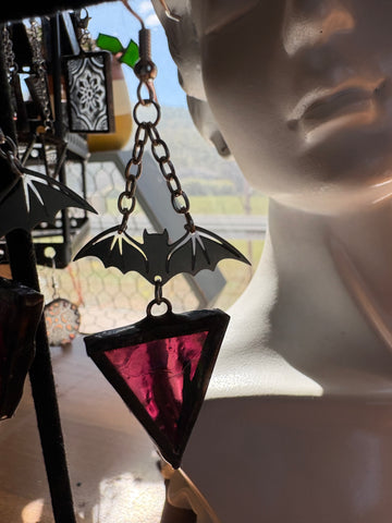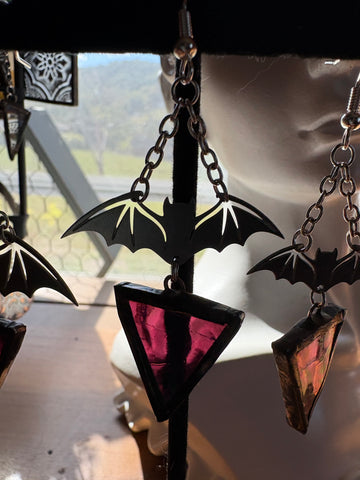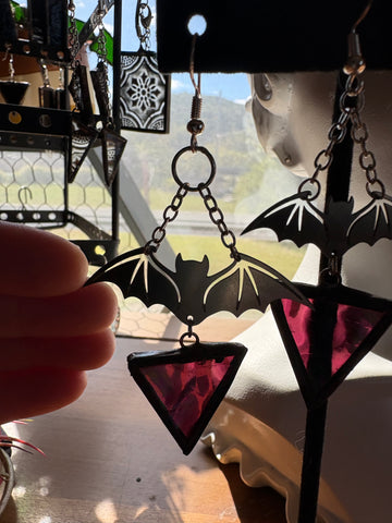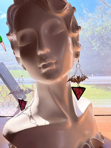 There are three sizes of bats, but all of the stained glass pieces are 1” triangles. These stained glass earrings are made in Tiffany style with copper foil and lead free solder, finished with black patina for an antique look. The earrings weigh in at 5 grams a piece and are on .925 sterling silver hooks. My pieces are all handmade, so there are slight irregularities that provide artistic uniqueness.