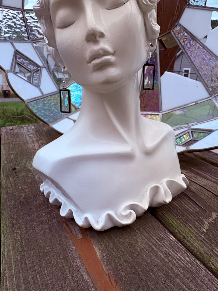 Hand cut 1” iridescent clear stained glass earrings made in Tiffany style with copper foil and lead free solder. These earrings weigh in at 2 grams a piece. For reference a US quarter weighs 6 grams. They have .925 silver hypoallergenic hooks. They are made from upcycled vintage stained glass lights.