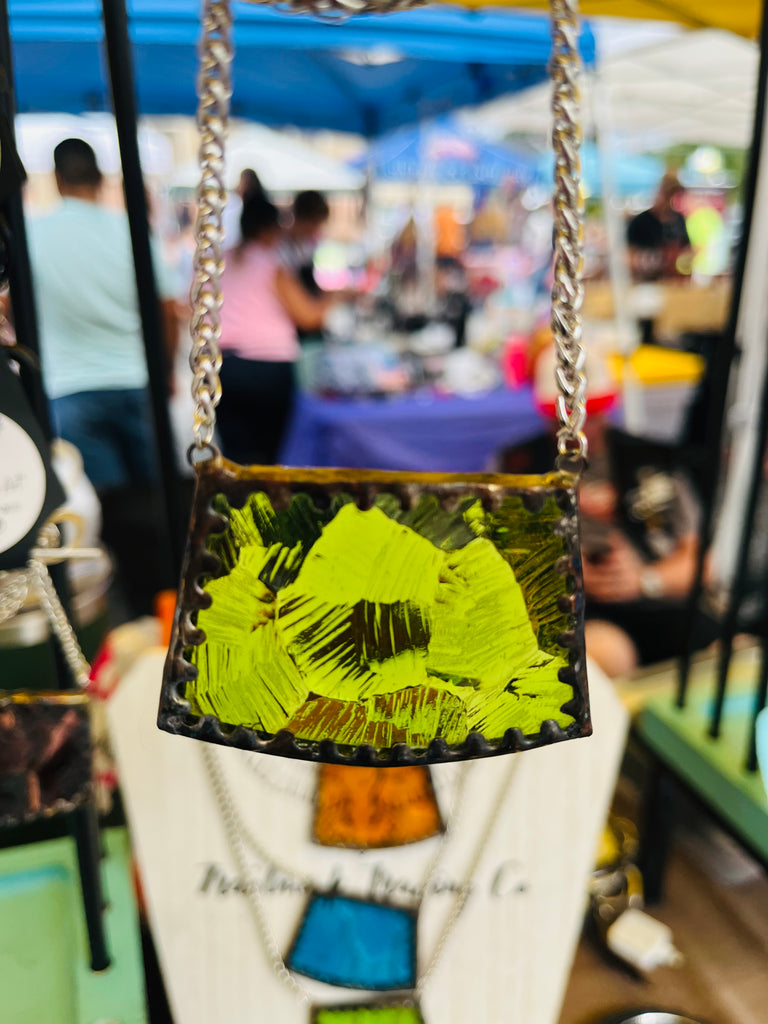 Upcycled stained glass sourced from a vintage light and made in Tiffany style with copper foil and lead free solder. The necklace is on a nickel free chain with a magnetic clasp.