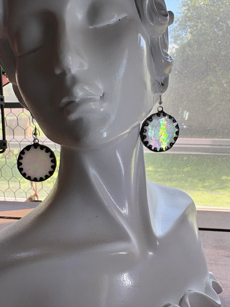 Hand cut 1.25” opalescent white stained glass earrings made in Tiffany style with copper foil and lead free solder. These earrings weigh in at 6 grams a piece. For reference a US quarter weighs 6 grams. They have .925 silver hypoallergenic hooks. They are made from upcycled vintage stained glass lights.