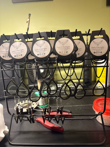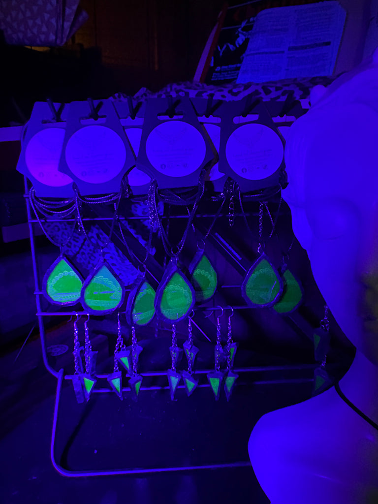 Upcycled pieces of a vintage uranium glass plate made in Tiffany style with copper foil and lead free solder. The piece of glass is a 1.5” teardrop and hangs from a black 18-20” adjustable cord. They will only glow under UV light.