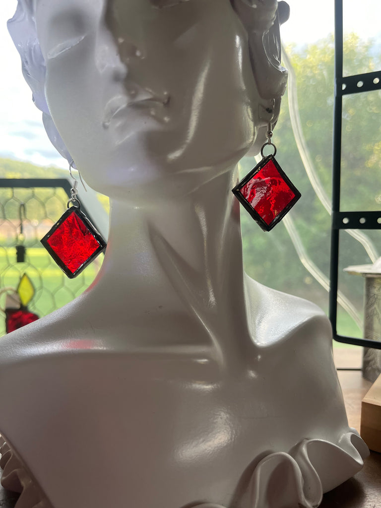 Gorgeous, upcycled, vintage water glass from a light. Hand cut stained glass made in Tiffany style with copper foil and lead free solder. These earrings weigh in at 6 grams a piece. For reference a US quarter weighs 6 grams. They have .925 silver hypoallergenic hooks.